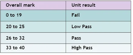 The grid below shows the range for each unit assessment result based on total number of marks awarded across all assessment criteria. To pass the unit assessment learners must achieve a 2 (Low Pass) or above for each of the assessment criteria. The overall result achieved will dictate the outcome the learner receives for the unit, provided NONE of the assessment criteria have been failed or referred.