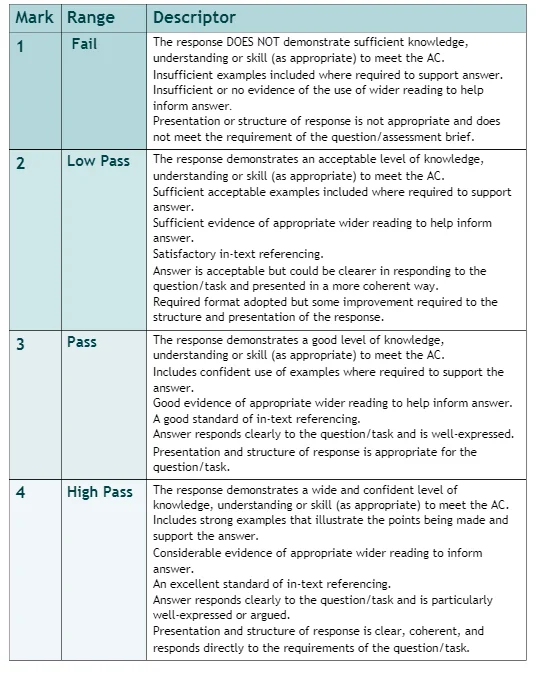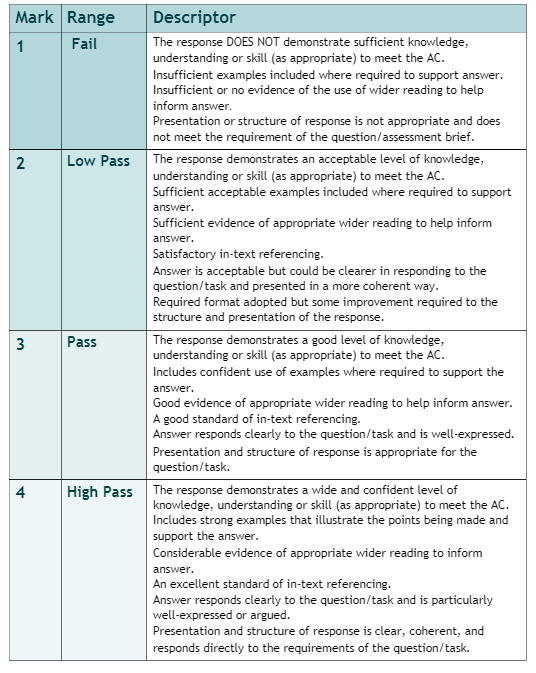 Assessors must provide a mark from 1 to 4 for each assessment criteria within the unit. Assessors should use the mark descriptor grid as guidance so they can provide comprehensive feedback that is developmental for learners. Please be aware that not all the mark descriptors will be present in every assessment criterion, so assessors must use their discretion in making grading decisions.
