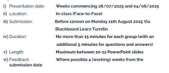 This will comprise of a 20mins (15mins presentation plus 5mins Q&A) timed group live presentation (groups will be finalised by the end of week 2) with presentations to take place in Week 8 (Week commencing 28/07/25) & Week 9 (Week commencing 04/08/25). Group presentation slides/cover page to be submitted before 12noon on Monday 11th August 2025 via Blackboard Turnitin. A group member (leader) should submit all slides, every other member should submit just the cover page. Cover page should have seminar tutor’s name, presentation title, campus (Birmingham/London), group number (e.g., Group A1), group members names, student ID and percentage contribution made to the presentation by each group member (equal participation means 25% for each member) Groups will consist of no more than 4 students with a mix of gender and nationalities – diverse mix a must!
