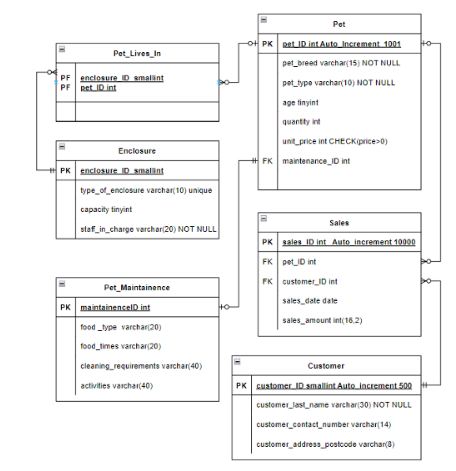 The pet shop owner identified the usage of database management systems and approved a database design for their pet shop’s inventory and sales data management, which is given as the physical model Entity Relationship diagram in the figure 1.