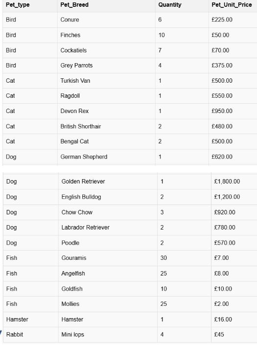 You have been assigned as a database developer to create a database for a pet shop. The pet shop is a sole trader in the UK, selling pet animals at affordable prices. Until now, all data relating to the animals in stock has been stored and managed manually using a paper based ledger. However, due to this manual way of processing, there have been times when data has been lost or incorrect and there are also concerns around data redundancy and security. There is also a need to improve the inventory and sales data management.